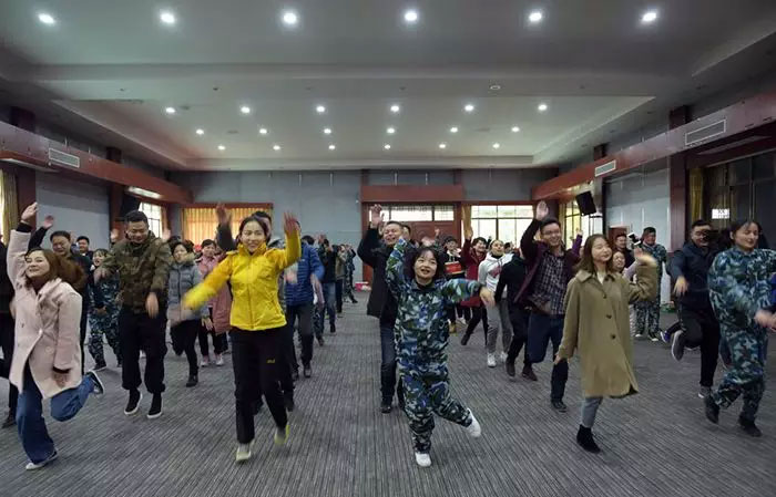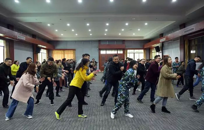 我們一齊圍成一個圈,互相拍拍肩、捶捶背,認(rèn)識熟悉,鼓勁加油。玩兒個“聽口令”的小游戲,被抓到的同志可是要上臺表演節(jié)目呢!