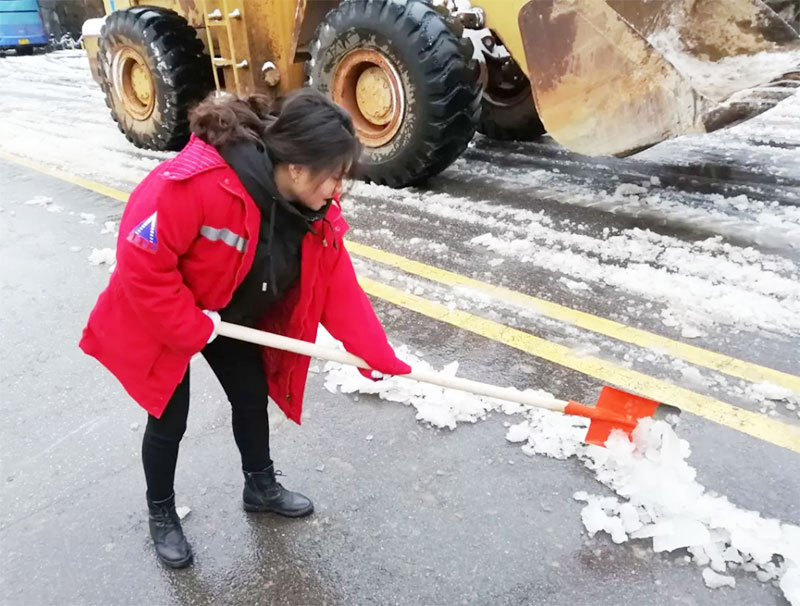 有想法就付諸于行動(dòng),簡(jiǎn)短交流后,員工們開始有效的分工安排,開裝載機(jī)、拿鐵鍬、用掃帚、撒工業(yè)鹽、保障物資等,默契合作。