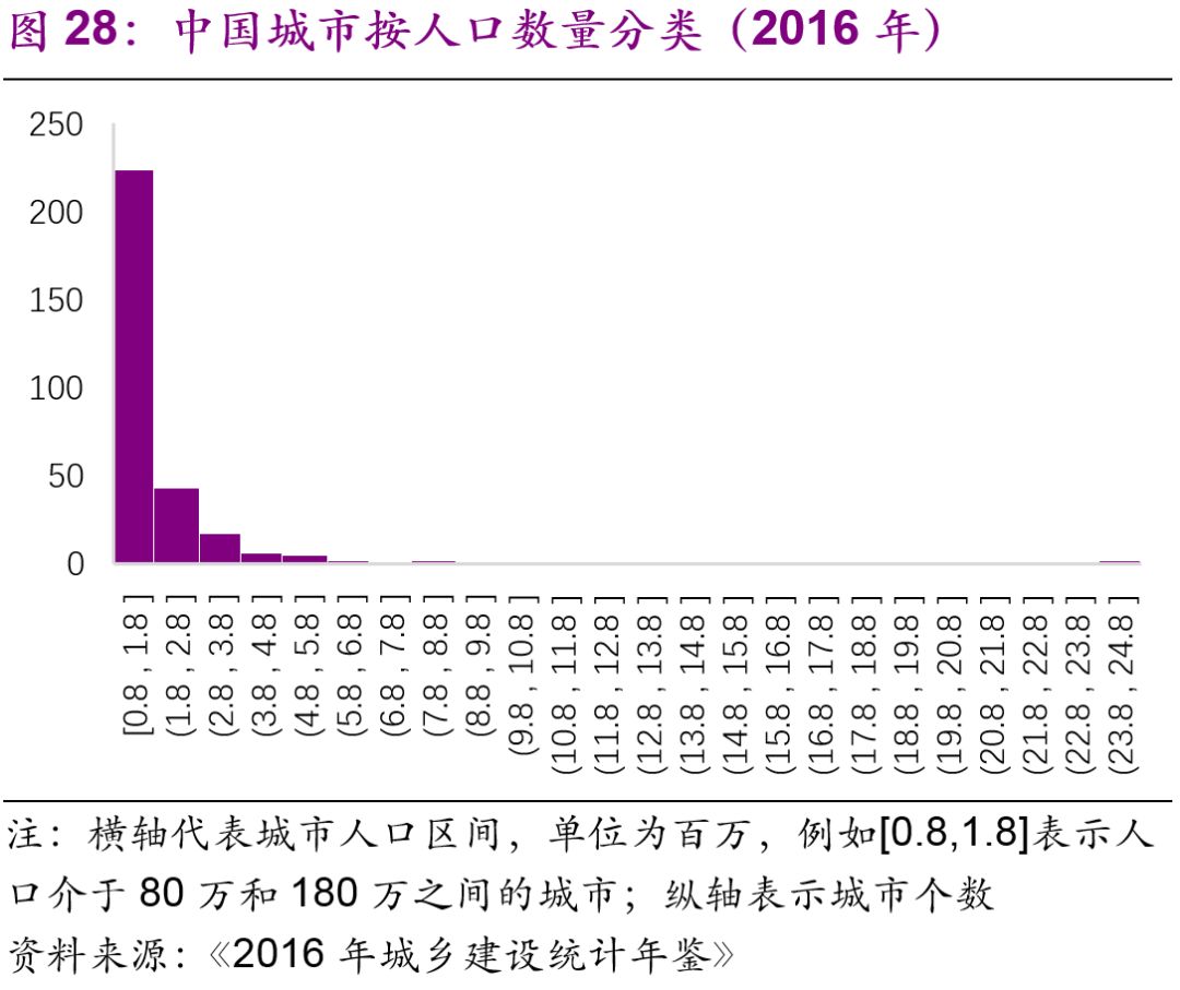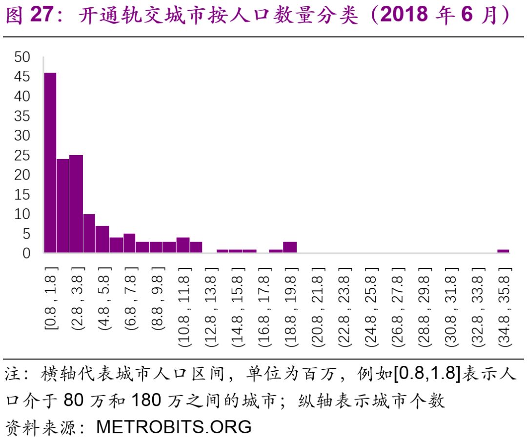 擬建地鐵、輕軌線路初期客運(yùn)強(qiáng)度分別不低于每日每公里0.7萬(wàn)人次、0.4萬(wàn)人次,遠(yuǎn)期客流規(guī)模分別達(dá)到單向高峰小時(shí)3萬(wàn)人次以上、1萬(wàn)人次以上。但是同時(shí)也強(qiáng)調(diào)了:“以上申報(bào)條件將根據(jù)經(jīng)濟(jì)社會(huì)發(fā)展情況按程序適時(shí)調(diào)整。”2016年,中國(guó)城市中市區(qū)常住人口在150萬(wàn)以上的城市共有111個(gè),對(duì)比目前已經(jīng)開(kāi)通軌道交通的城市數(shù)量(34個(gè)),仍有一定的發(fā)展空間。而從國(guó)際上看,建設(shè)軌道交通的城市人口的起點(diǎn)[19]大約為100萬(wàn)(圖27),如果長(zhǎng)期內(nèi)中國(guó)將建設(shè)軌道交通的人口標(biāo)準(zhǔn)下調(diào)至100萬(wàn),那么將有225個(gè)城市符合標(biāo)準(zhǔn)(圖28)。