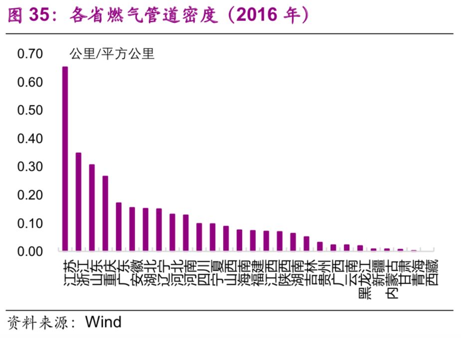 管道長(zhǎng)度遠(yuǎn)低于美國(guó)等國(guó)家。2016年,中國(guó)的管道長(zhǎng)度為12.6萬(wàn)公里,大幅低于美國(guó)(222.5萬(wàn)公里,2013年數(shù)據(jù))、俄羅斯(26.0萬(wàn)公里,2007年水平)(圖20)。從密度和人均水平上來(lái)看,2016年中國(guó)管道密度為0.013公里/平方公里,與日本(0.013公里/平方公里)、俄羅斯(0.016公里/平方公里)相當(dāng),但遠(yuǎn)低于美國(guó)(0.24公里/平方公里)、英國(guó)(0.16公里/平方公里)等西方發(fā)達(dá)國(guó)家(圖9);