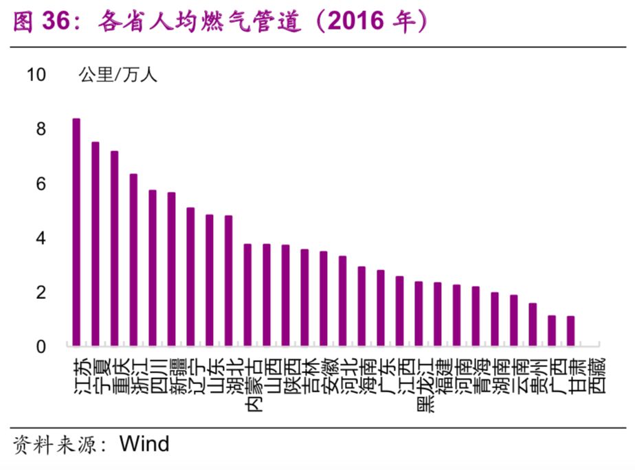 能源基礎(chǔ)設(shè)施方面,東部地區(qū)普遍高于中西部地區(qū)。2016年,燃?xì)夤艿烂芏扰琶叭氖墙K(0.65公里/平方公里)、浙江(0.35公里/平方公里)、山東(0.31公里/平方公里)(圖35);人均燃?xì)夤艿繹22]排名前三的也是浙江(8.4公里/萬(wàn)人)、寧夏(7.5公里/萬(wàn)人)、重慶(7.2公里/萬(wàn)人)(圖36)。
