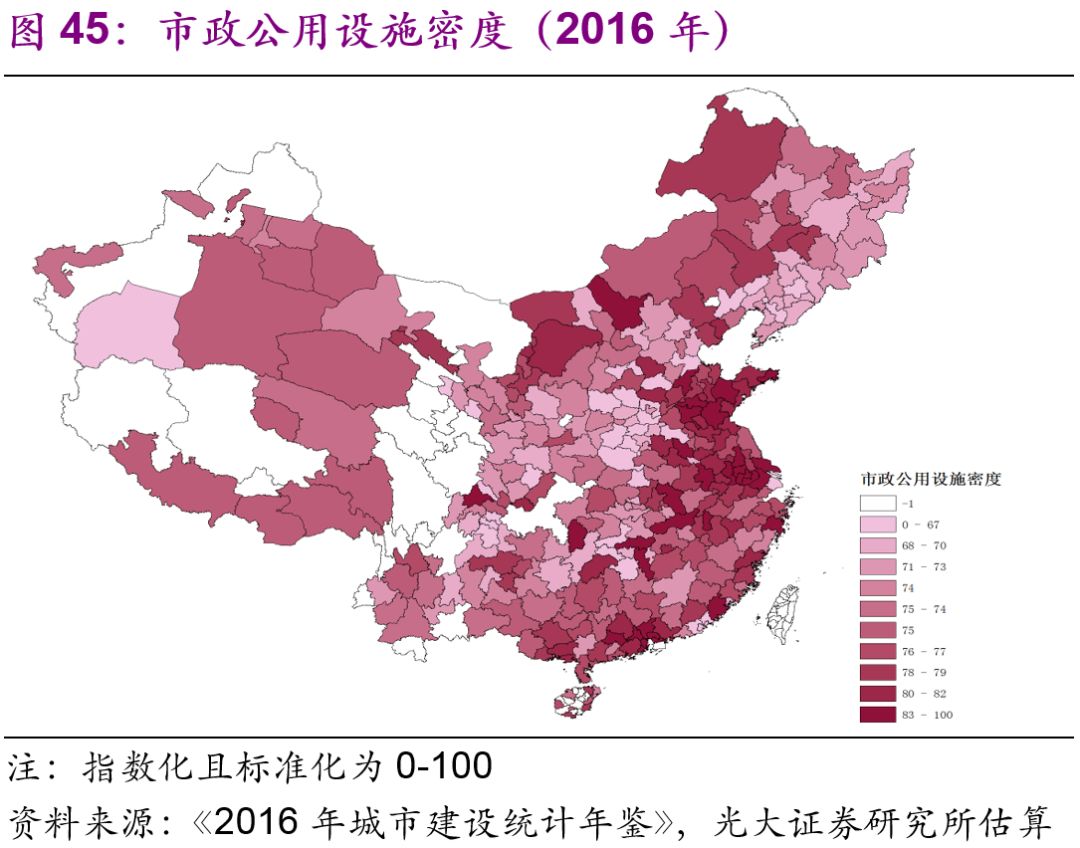 東部和部分西部城市的市政公用設(shè)施水平較高。為了綜合分析各個(gè)城市的市政公用設(shè)施水平,我們使用主成份分析法,選取人均日生活用水量、人均道路面積、人均公園綠地面積,對(duì)2016年中國(guó)各城市得出了綜合的城市市政公用設(shè)施的總量[27]、密度(圖45-46)和人均水平(圖47-48)進(jìn)行了比較。無(wú)論從總量、密度還是人均水平上來(lái)看,東部和部分西部城市都比較高,反而是一些中部和東北部城市的城市市政公用設(shè)施水平處于全國(guó)比較落后的狀態(tài)。