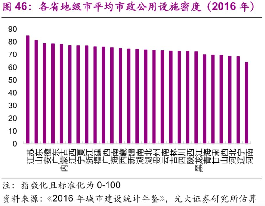 歷史上城市市政公用設(shè)施投資增速與總體基礎(chǔ)設(shè)施建設(shè)投資增速相關(guān)性較高,但近年來(lái)分化加大。而2014年開(kāi)始實(shí)行的規(guī)范地方政府債務(wù)的一系列舉措使得當(dāng)年的城市市政公用設(shè)施投資增速轉(zhuǎn)負(fù),2014、2015年的增速分別為-0.63%、-0.25%,直到2016年才轉(zhuǎn)正。而城市市政公用設(shè)施投資占總體基礎(chǔ)設(shè)施建設(shè)投資的比例則不斷下降,2016年僅為11.5%,較2003年的高點(diǎn)(32.6%)下降了21個(gè)百分點(diǎn)(圖43)。